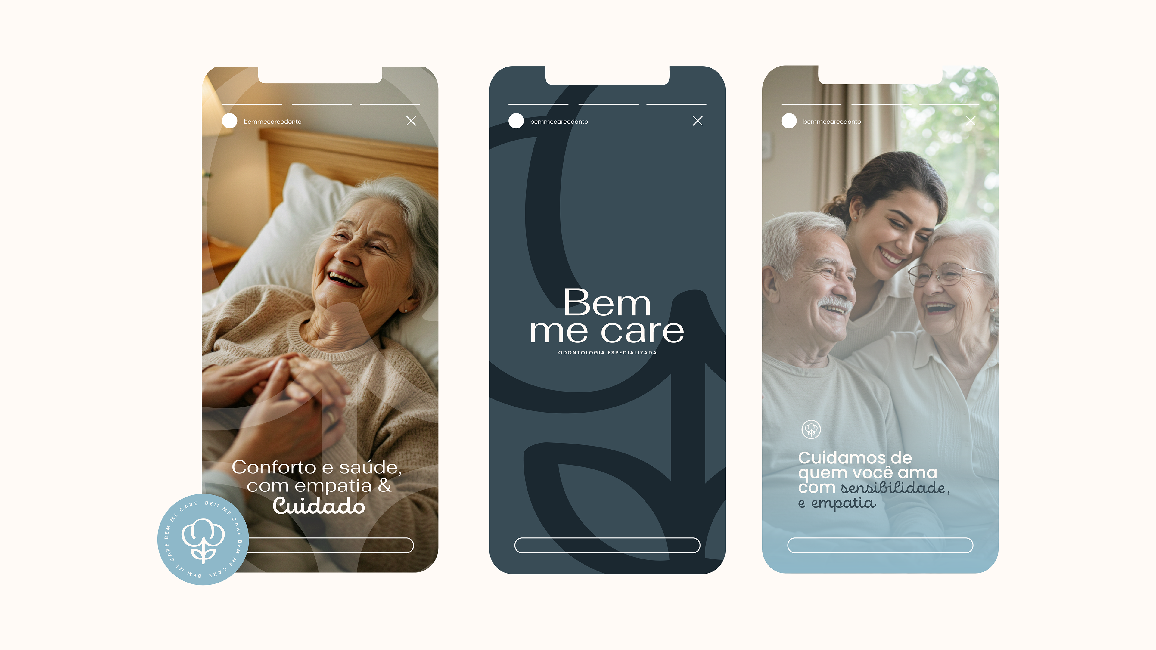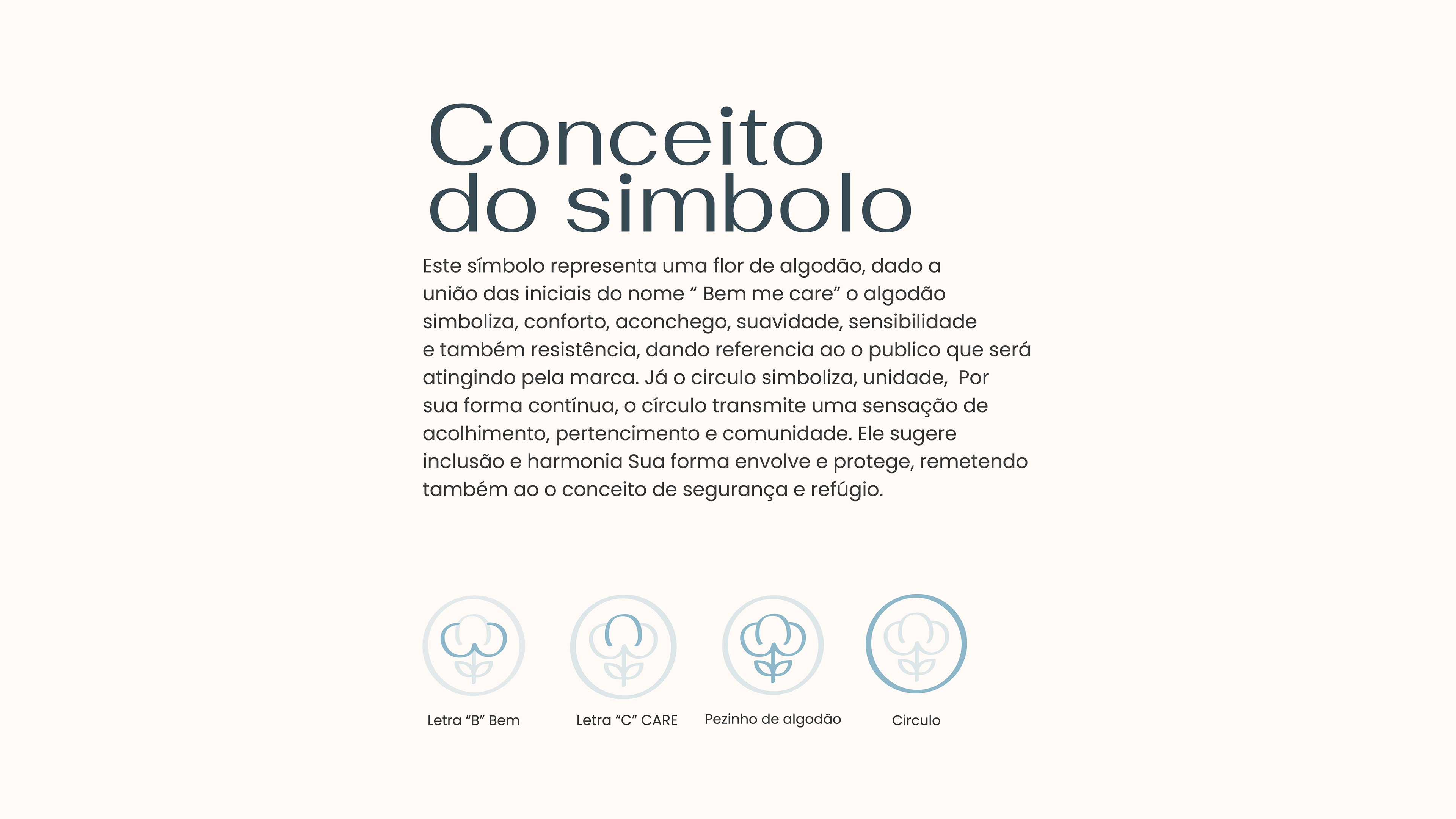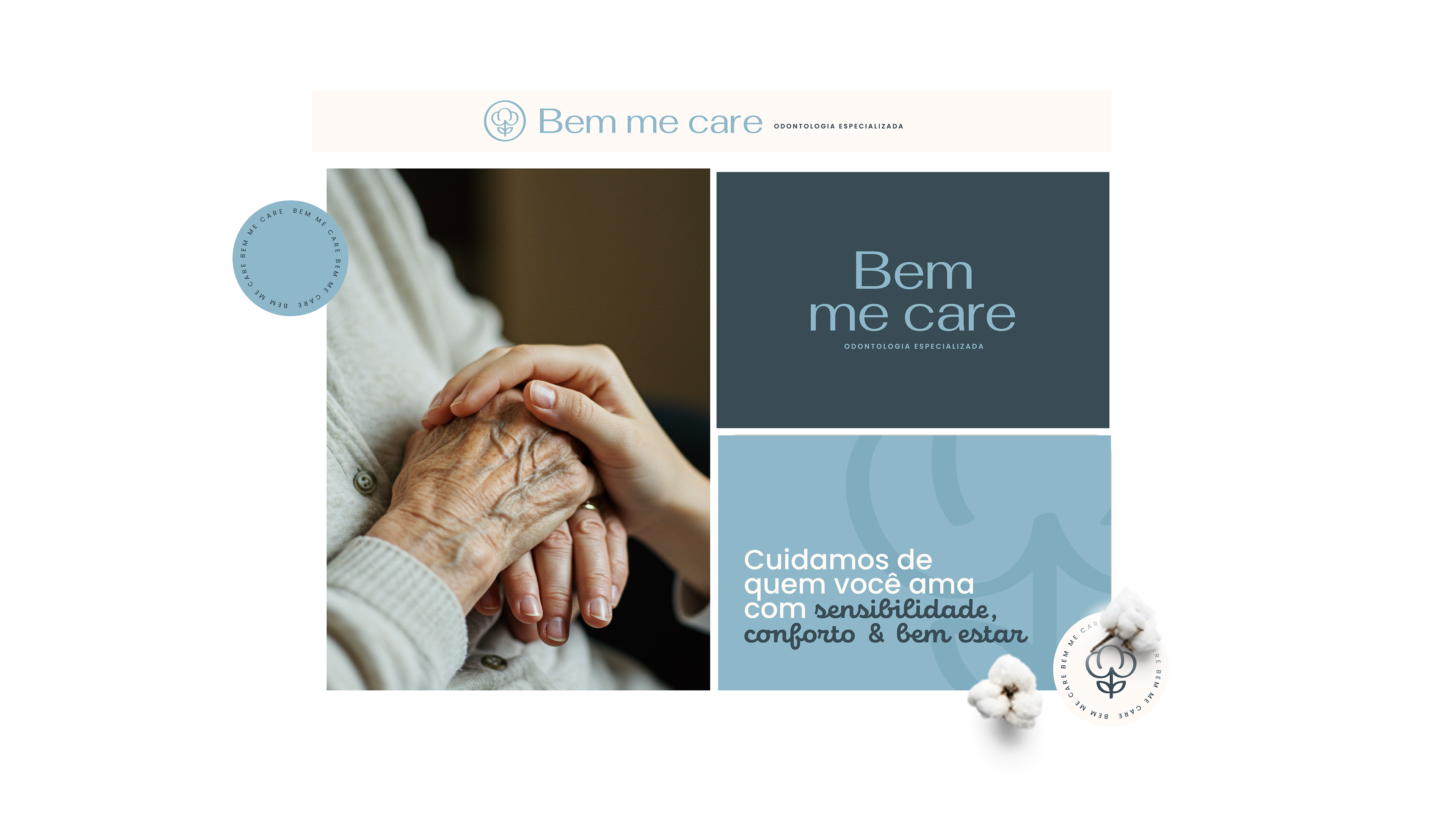 A Bem Me Care é um consultório odontológico especializado em atendimento domiciliar. Criada pela Emily, com um propósito muito claro: levar cuidado odontológico humanizado, acessível e integral até pacientes que não conseguem sair de casa. Idosos, acamados, pessoas com câncer, diabetes e outras condições de saúde que exigem atenção especial. Pacientes que, muitas vezes, são esquecidos pelo sistema de saúde tradicional, mas que também merecem ser cuidados com sensibilidade, respeito e afeto. Foi desse olhar sensível e dessa vontade de fazer diferente que nasceu a Bem Me Care. O nome carrega um trocadilho entre “bem-me-quer” e “care” (cuidado, em inglês), refletindo a alma da marca: um cuidado que vai além do consultório e chega até quem mais precisa. Na identidade visual, usamos a flor de algodão como símbolo. Ela representa tudo o que a marca entrega no dia a dia: conforto, sensibilidade, resistência e acolhimento. As cores suaves reforçam essa sensação de tranquilidade e confiança, criando uma marca leve, empática, aconchegante e segura.