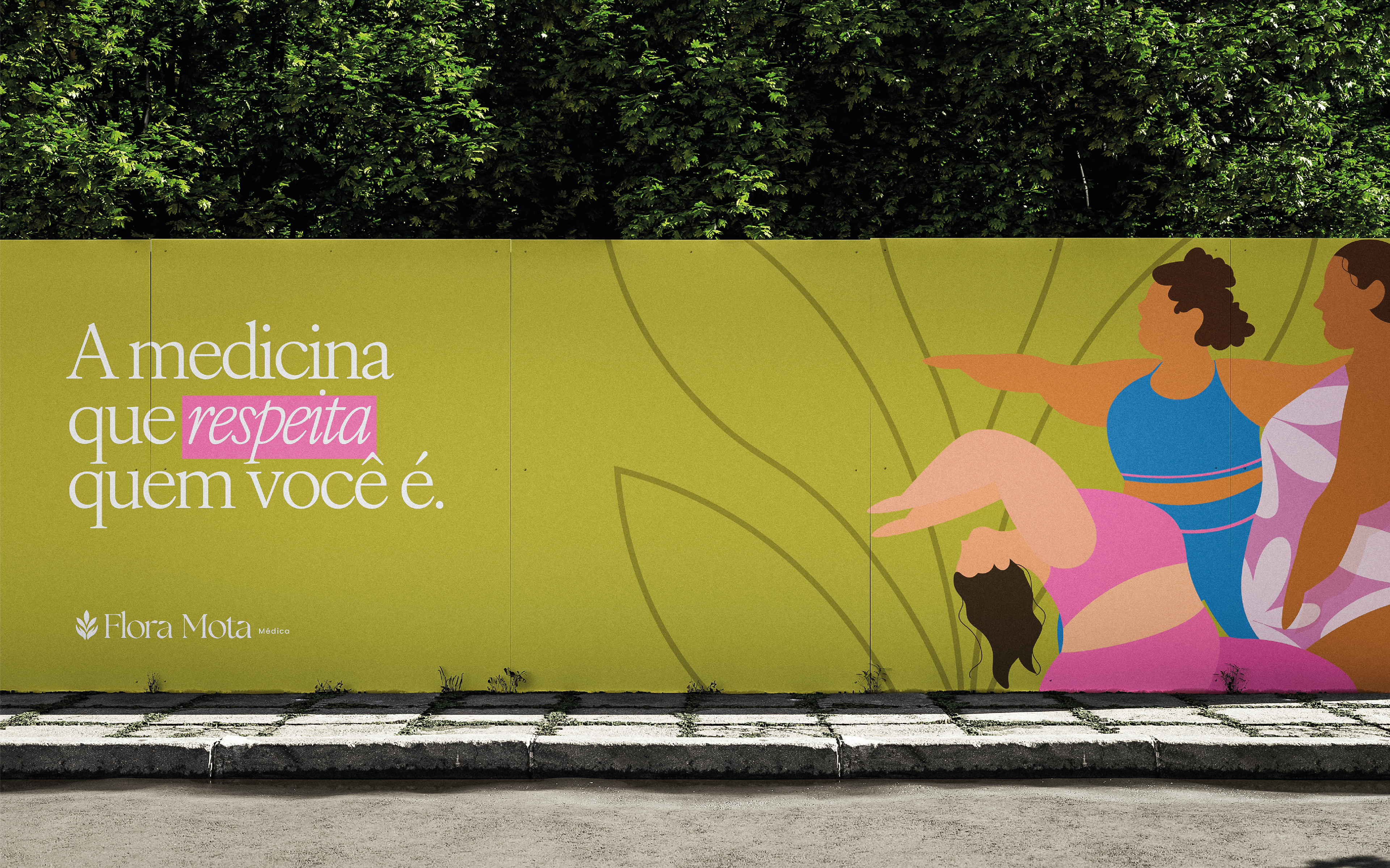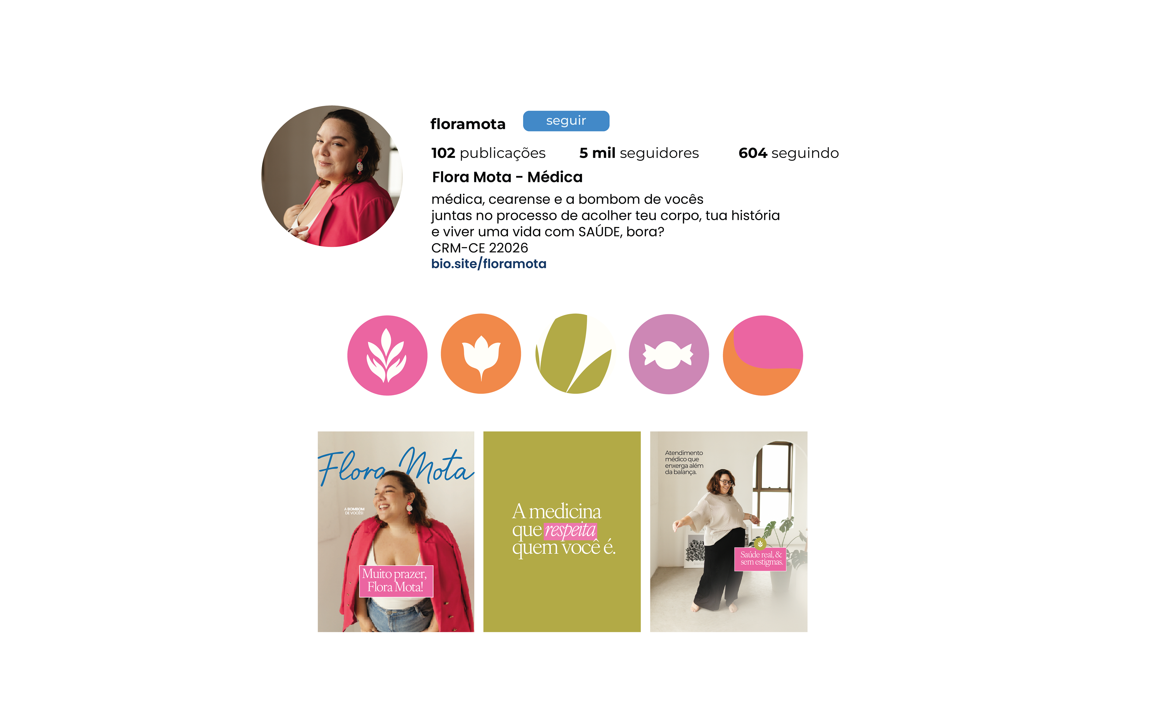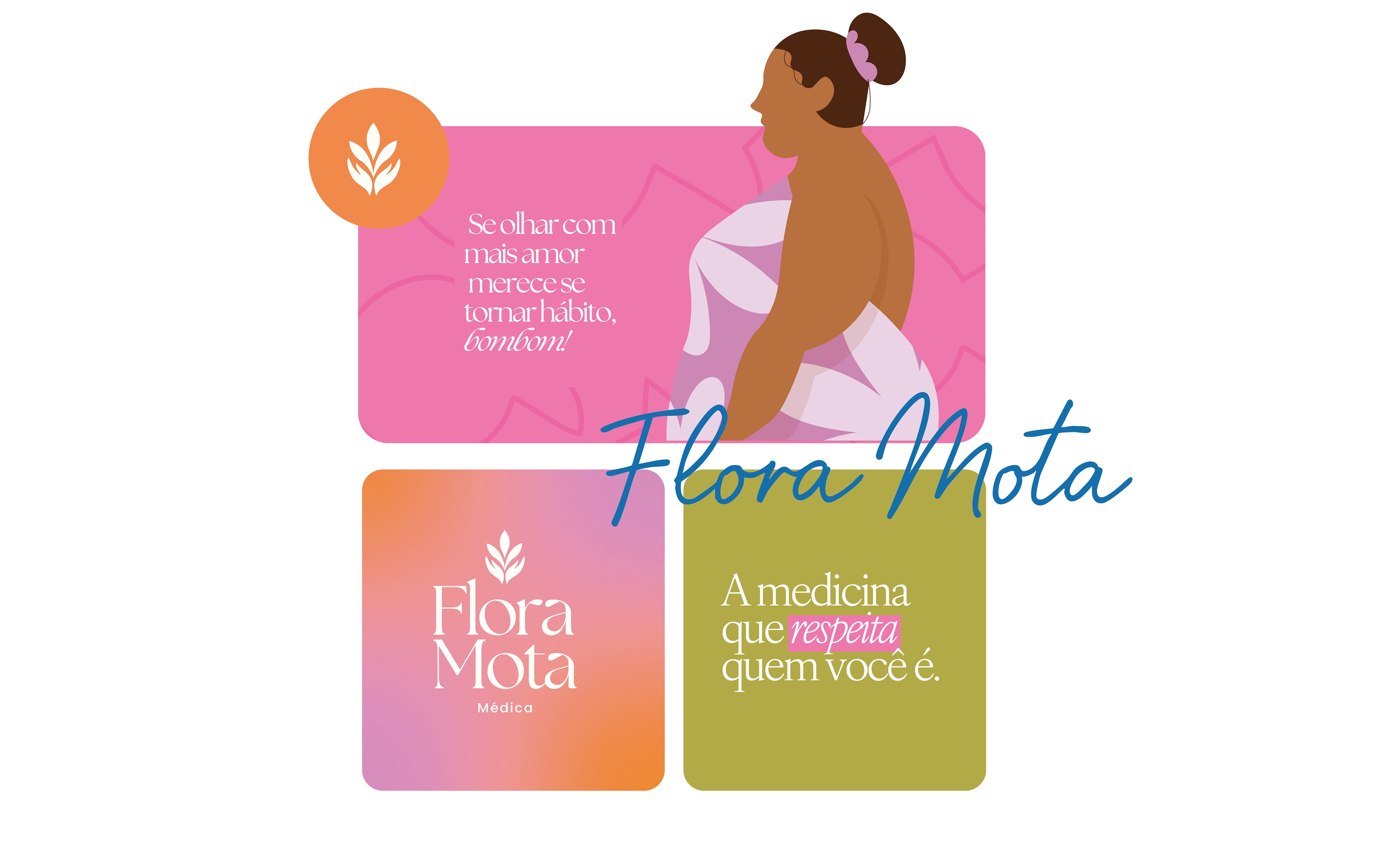 Flora é médica de família e atua com pessoas com obesidade. Seu cuidado começa na escuta e se estende a cada detalhe do atendimento sempre com empatia, firmeza e sem julgamento. Uma medicina sem estigmas, onde alguém realmente te enxerga além dos números da balança. Flora estava vivendo uma nova fase profissional, focada ainda mais em suas bombons (como ela carinhosamente chama suas pacientes). Mas sua marca já não acompanhava esse momento. Ela queria sair do óbvio da área da saúde, romper com padrões visuais que não conversavam com a forma como ela cuida. A nova identidade visual nasceu desse desejo. O símbolo representa esse encontro: de quem acolhe com mãos abertas e de quem começa a se olhar com mais amor. As cores trazem empoderamento, liberdade, autonomia e energia. Antes dos padrões impostos, veio o que realmente importa: a essência da Flora. A identidade visual que criamos representa quem ela é, o que ela acredita e o que defende como médica. Uma marca construída a partir da sua verdade e que agora traduz com autenticidade o que já existia no seu jeito de cuidar.