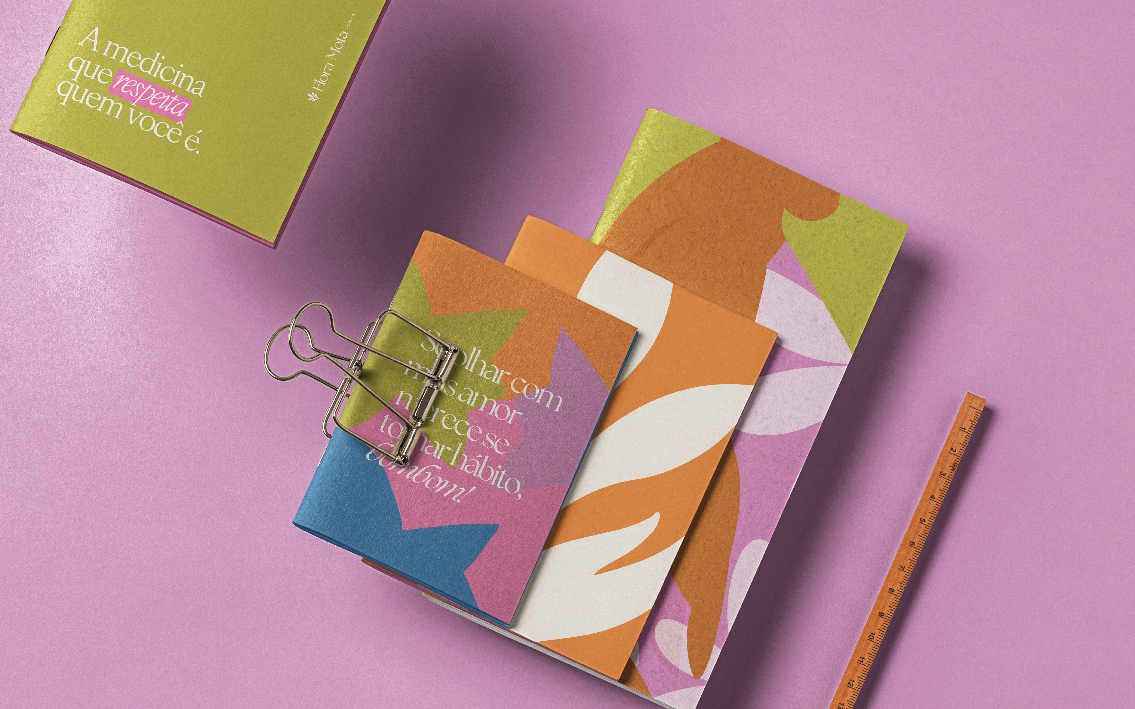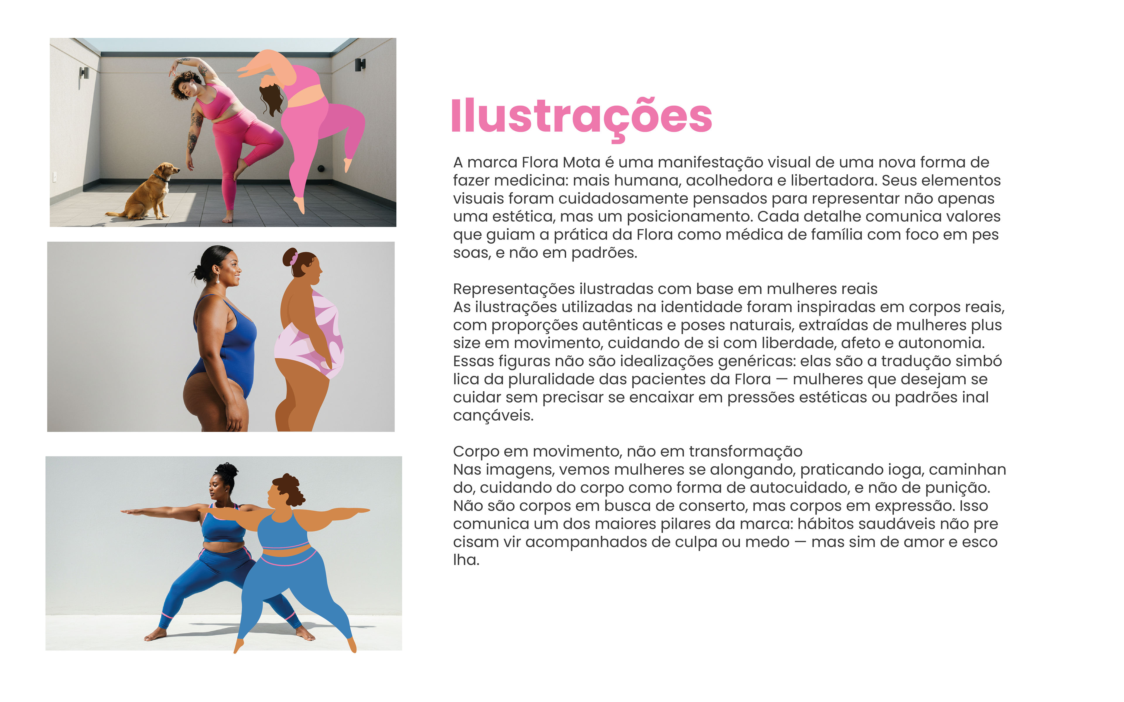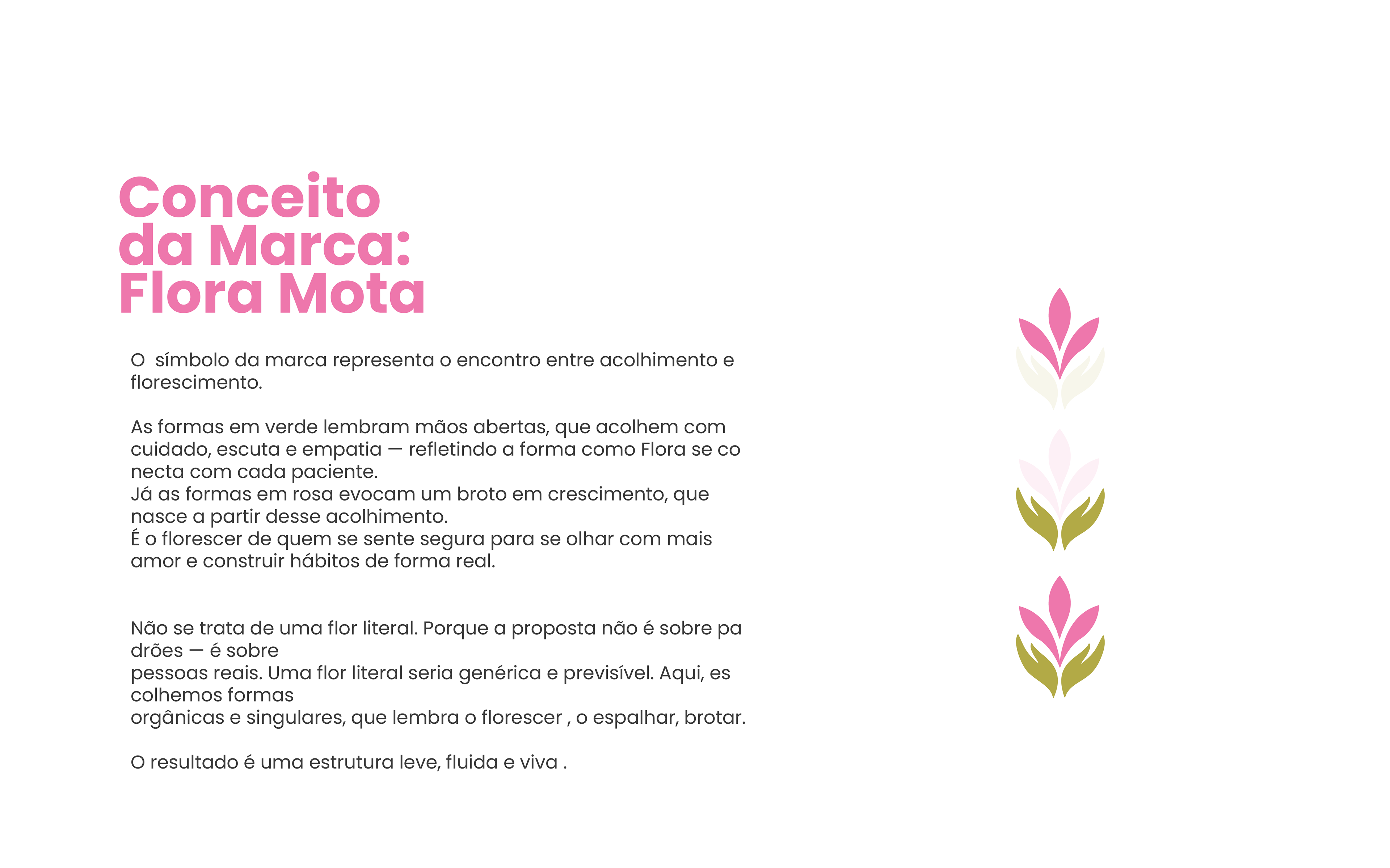 Flora é médica de família e atua com pessoas com obesidade. Seu cuidado começa na escuta e se estende a cada detalhe do atendimento sempre com empatia, firmeza e sem julgamento. Uma medicina sem estigmas, onde alguém realmente te enxerga além dos números da balança. Flora estava vivendo uma nova fase profissional, focada ainda mais em suas bombons (como ela carinhosamente chama suas pacientes). Mas sua marca já não acompanhava esse momento. Ela queria sair do óbvio da área da saúde, romper com padrões visuais que não conversavam com a forma como ela cuida. A nova identidade visual nasceu desse desejo. O símbolo representa esse encontro: de quem acolhe com mãos abertas e de quem começa a se olhar com mais amor. As cores trazem empoderamento, liberdade, autonomia e energia. Antes dos padrões impostos, veio o que realmente importa: a essência da Flora. A identidade visual que criamos representa quem ela é, o que ela acredita e o que defende como médica. Uma marca construída a partir da sua verdade e que agora traduz com autenticidade o que já existia no seu jeito de cuidar.